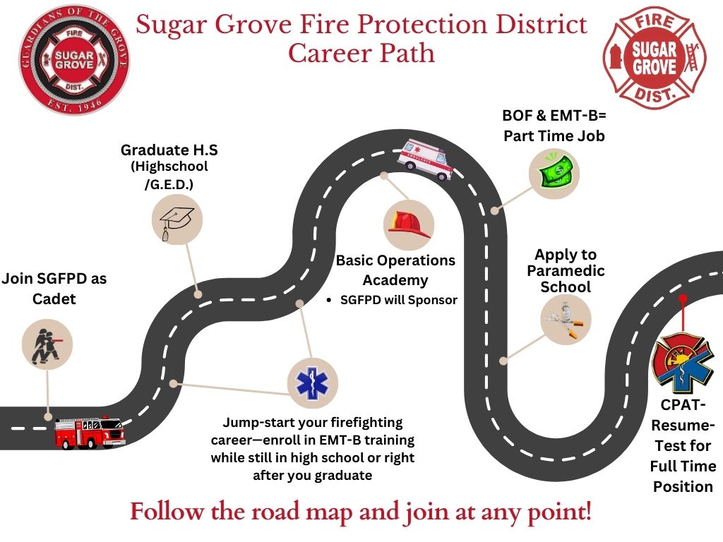 The Sugar Grove Fire Protection District Cadet Program was formed to make a positive lasting impact on the firefighters and emergency medical providers of tomorrow by giving them the ability to achieve their highest potential by instilling within them the discipline, respect, honor, excellence, and higher level of education of the fire service that will leave an overall everlasting impression on our community today and in the future.